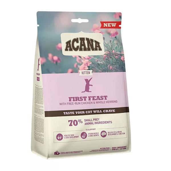 Rozpocznij życie swojego kociaka dzięki karmie pełnej składników pochodzenia zwierzęcego. ACANA First Feast stworzona została z myślą o zapewnieniu kociętom wszystkiego, czego potrzebują dla prawidłowego wzrostu i rozwoju. Formuła przepełniona jest kurczakiem z wolnego wybiegu i całym śledziem w proporcjach WholePrey: mięsa, narządów, chrząstek i kości. Dzięki temu zapewnia kociętom wszystko to, co ważne dla ich zdrowia i szczęścia. Ma przy tym niezwykle pyszny smak, który Twój kociak pokocha.