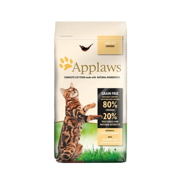 Applaws sucha karma dla kotów jest unikalną w swojej formule kompletną dietą, symulującą naturalny pokarm jakim odżywiają się koty na wolności. Koty są mięsożerne i ich system trawienny jest nastawiony na mięso. Sucha karma Applaws zawiera wysoką ilość białka zwierzęcego bez dużego poziomu węglowodanów i dodatków zbożowych występujących w innych karmach. Karma Applaws jest dzięki temu hipoalergiczna, bo nie zawiera typowych alergenów, jak soja, pszenica, kukurydza, czy innych zbóż. Zawiera zestaw antyutleniaczy, jak selen, naturalny tokoferol (witamina E), olej rozmarynowy. Naturalne kwasy Omega 3 i 6 wspomagają kondycję sierści. Wyciąg z żurawiny udrażnia drogi moczowe oraz wspomaga system trawienny. Naturalne prebiotyki wspomagają rozwój bakterii potrzebnych organizmowi do właściwej pracy układu trawiennego. Pokarm zawiera formułę odkłaczającą. Sucha Karma Applaws ma wręcz idealne proporcje zawartości wapnia i fosforu, spełniając w 100% zalecenia i limity organizacji FEDIAF.