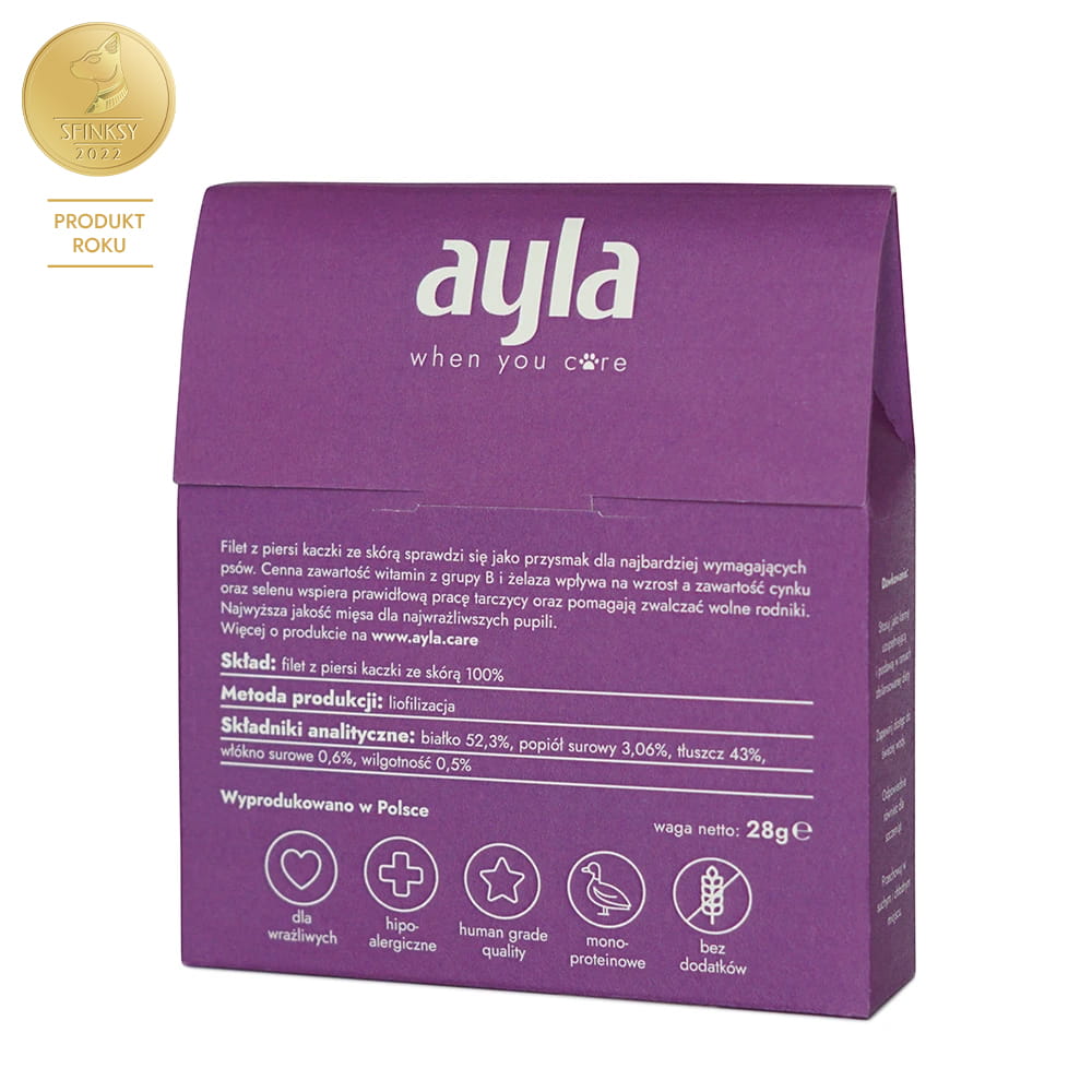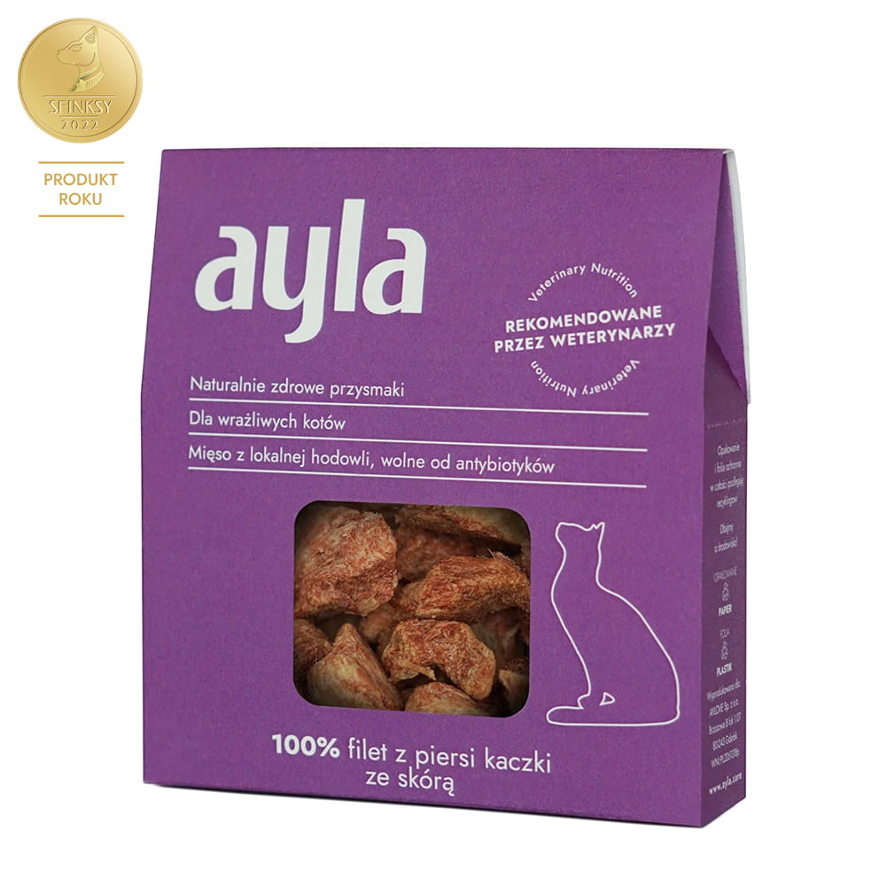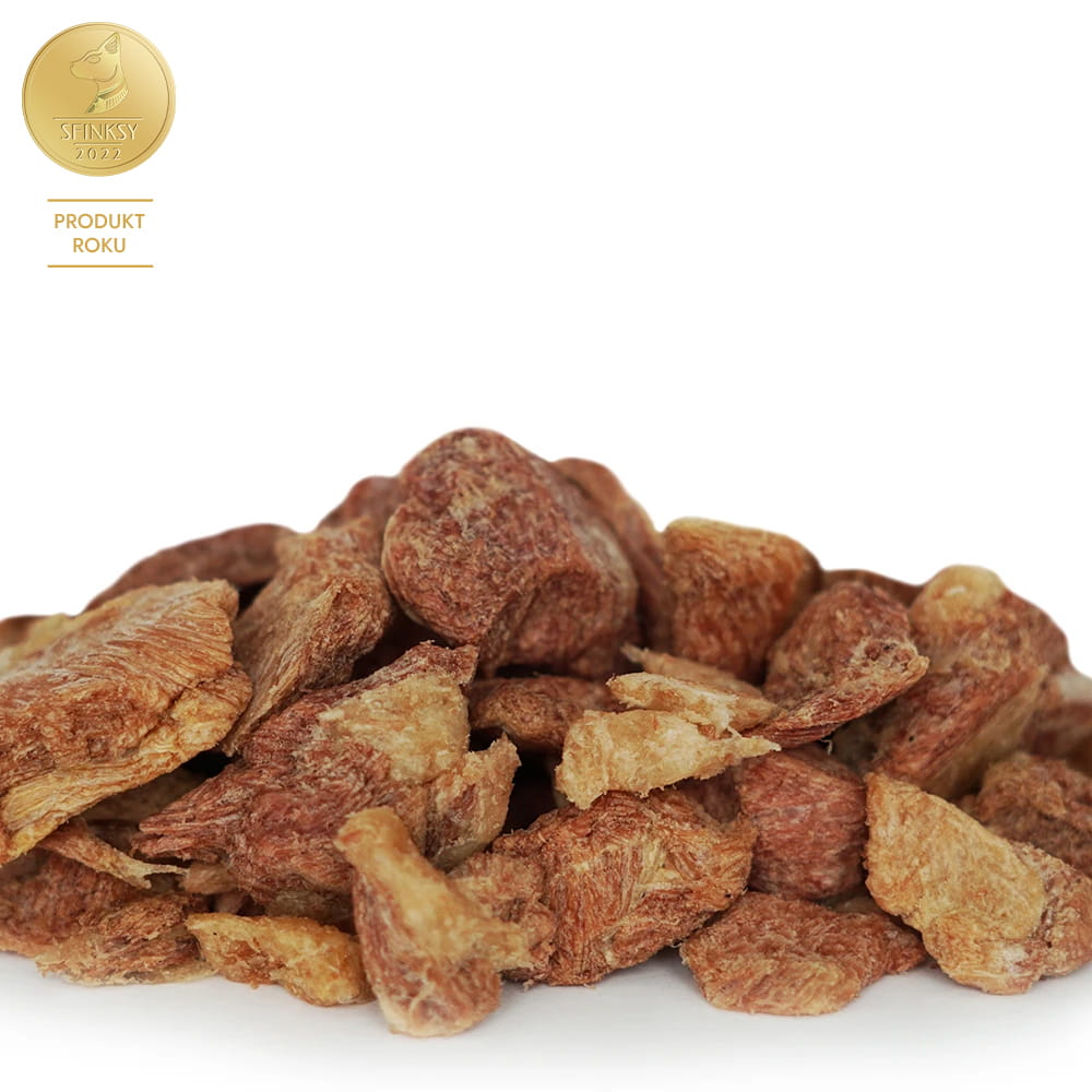 Liofilizowany filet z piersi kaczki ze skórą charakteryzuje się wysoką zawartością białka. Jest źródłem nienasyconych kwasów tłuszczowych, tak korzystnych dla zdrowia, jak również mikroelementów, takich jak potas, żelazo, fosfor, magnez i witaminy A oraz witamin z grupy B, które przyczyniają się do prawidłowego metabolizmu i wzmocnienia kociej odporności. Liofilizowane kawałki mięsa idealnie sprawdzą się w jako przekąska lub urozmaicenie codziennej kociej diety. Są odpowiednie również dla kociąt.