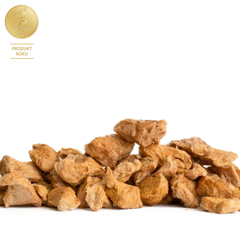 Liofilizowany filet z uda indyka zawiera cenne dla Twojego kota mikroelementy takie jak fosfor, potas, magnez, żelazo oraz witaminy z grupy B, które mają wpływ na m.in. funkcjonowanie układu odpornościowego, nerwowego i krwionośnego. Udo zawiera więcej tłuszczu niż pierś z indyka, który jest bardzo ważnym źródłem energii oraz niezwykle cenionym nośnikiem smaku i aromatu. Liofilizowane kawałki mięsa idealnie sprawdzą się w jako przysmak lub urozmaicenie codziennej kociej diety. Są odpowiednie również dla kociąt.