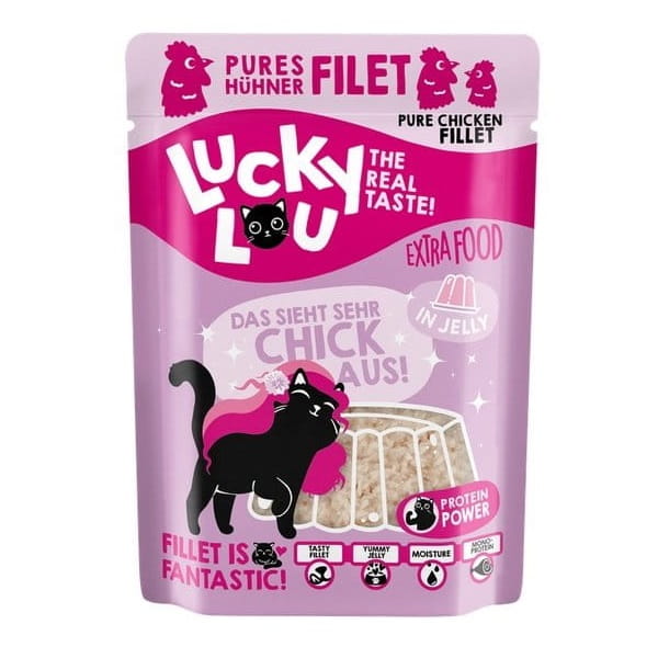 Koty, lubią być rozpieszczane. Też lubisz od czasu do czasu prawdziwą ucztę, prawda? Dokładnie tak samo jest z kotami. Kochają dodatki! I dlatego do linii karm mokrych dodaliśmy Lucky Lou Extra Food. To soczysty filet przygotowany w galarecie lub w bulionie. To jest ekstra pyszne!