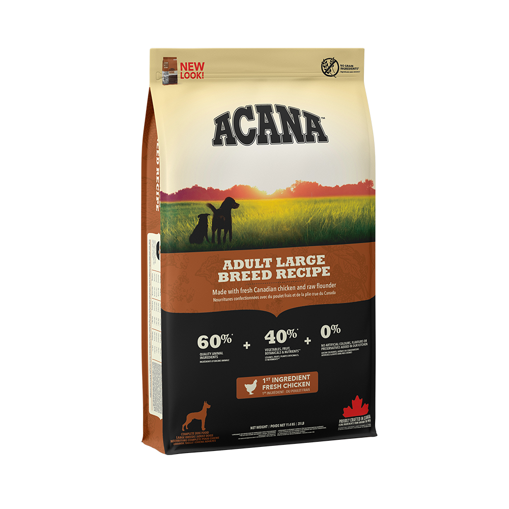 Karma dla psów Acana Adult Large Breed to biologicznie odpowiednie jedzenie dla Twojego psa. Psy to mięsożercy. Są przystosowane do diety bogatej w białko zwierzęce, które zapewnia im szczytową kondycję i zdrowie. Biologicznie Odpowiednia Filozofia marki Acana jest prosta: odzwierciedlać ilość, świeżość i różnorodność mięs, ograniczając jednocześnie syntetyczne składniki, które nie należą do naturalnej diety psa.