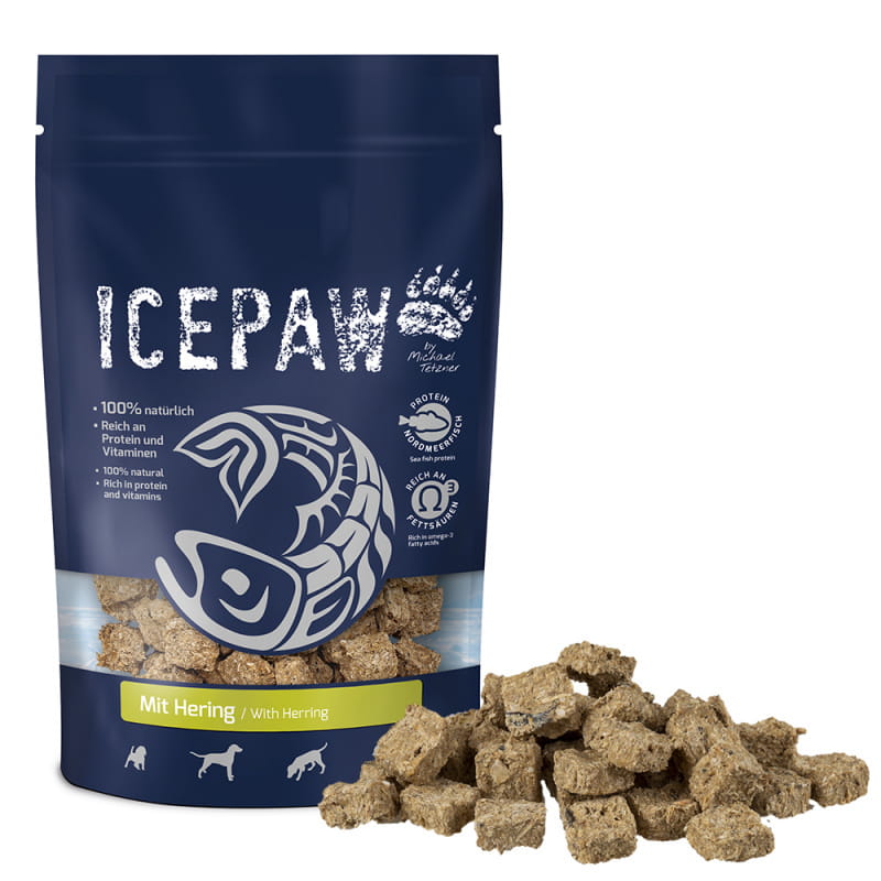 Przysmaki Icepaw są w 100% naturalne, bogate w witaminy i minerały oraz kwasy Omega-3. Zawierają filety z białych ryb (80%) i śledzia (20%), przetwarzane tuż po złowieniu i delikatnie suszone powietrzem w temperaturze 20° C przez 48 godzin, co zapewnia optymalne zachowanie składników odżywczych, w tym kwasów Omega-3 wrażliwych na wysokie temperatury.