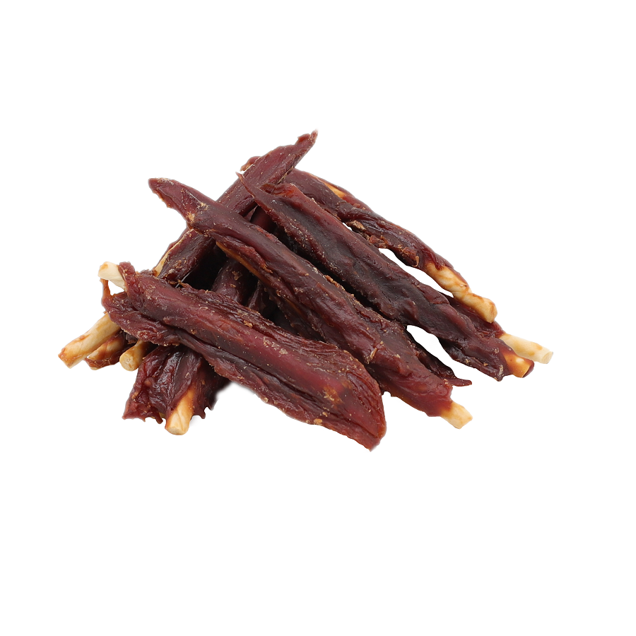 Skład: Pierś z kaczki 60%, skóra wołowa 30,9%, białko roślinne, skrobia kukurydziana, gliceryna.