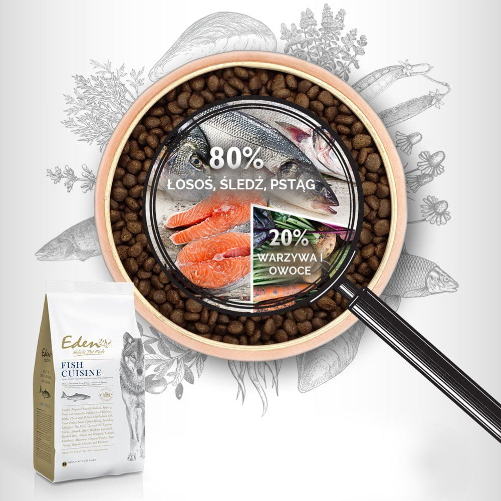 Karma dla psa EDEN Fish Cuisine jest tworzona wyłącznie z najlepszych rybnych składników: szkockiego łososia, śledzia północnoatlantyckiego oraz sezonowo dostępnych ryb – dorsza, plamiaka, morszczuka, mintaja i gładzicy.