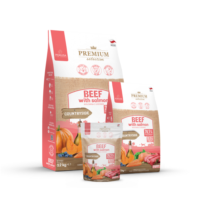 Skład: wołowina 40 % (w tym 25 % suszona wołowina, 15 % świeża wołowina), suszone ziemniaki, tłuszcz wołowy 7 %, hydrolizowane białko wieprzowe 4 %, suszony łosoś 4 %, wysłodki buraczane suszone (z buraków cukrowych), suszona dynia 1 %, suszona marchew 1 %,suszone jabłko 1 %, suszone drożdże piwne, olej z łososia 0,5 %, suszona cykoria 0,5 %, MOS (0,5 % - mananooligosacharydy), składniki mineralne, suszone brokuły, suszone pomidory, suszony szpinak 0,15 %, glukozamina, siarczan chondroityny, suszona żurawina, suszone jagody 0,15 %, ekstrakty roślinne(Yucca Mojave, Rosmarinus sp.0,05 %, Curcuma sp., Citrus sp., Eugenia sp.).