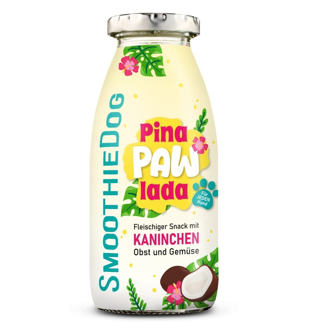 Żaden czworonożny przyjaciel nie oprze się smakowi i zapachowi mięsnego smoothie przygotowanego z mięsa królika wraz z pysznymi warzywami, owocami i superfoods. Orzeźwiający SmoothieDog PINA PAW LADA zawiera aromatyczne, delikatne i pożywne mięso z królika z jabłkami i gruszkami oraz pachnącymi latem bananami i wiórkami kokosowymi. Połączenie to sprawia, że to specjalne smoothie jest prawdziwym przysmakiem i nie powoduje uczucia ciężkości w żołądku w upalne letnie dni.