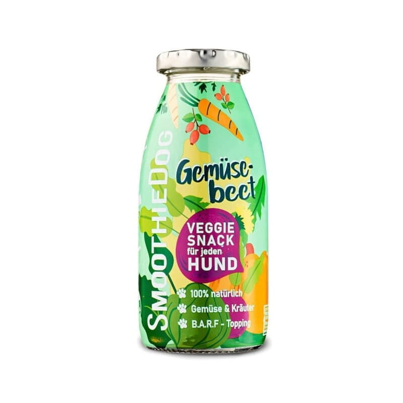 Całkowicie bezmięsna odmiana SmoothieDog znajdzie wielu entuzjastycznych fanów, bo przecież każdy pies potrzebuje w diecie warzyw i owoców. Ta wegańska przekąska dla psów sprawdzi się w szczególnych potrzebach psów, np. w momencie kiedy pies powinien minimalizować białko zwierzęce w diecie lub jest na diecie eliminacyjnej.