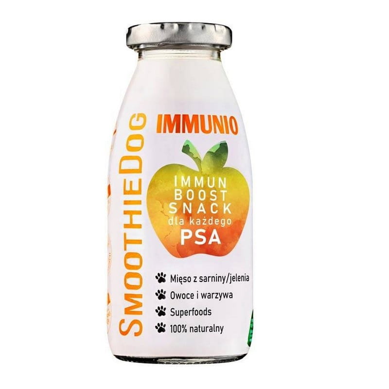 Odkryj SmoothieDog IMMUNIO Boost Snack, unikalną zdrową przekąskę dla psów, która wspiera odporność Twojego pupila dzięki specjalnej recepturze z dziczyzną.