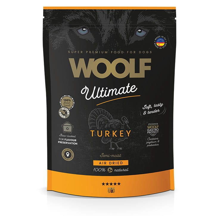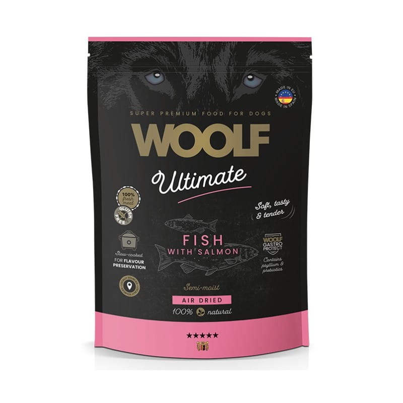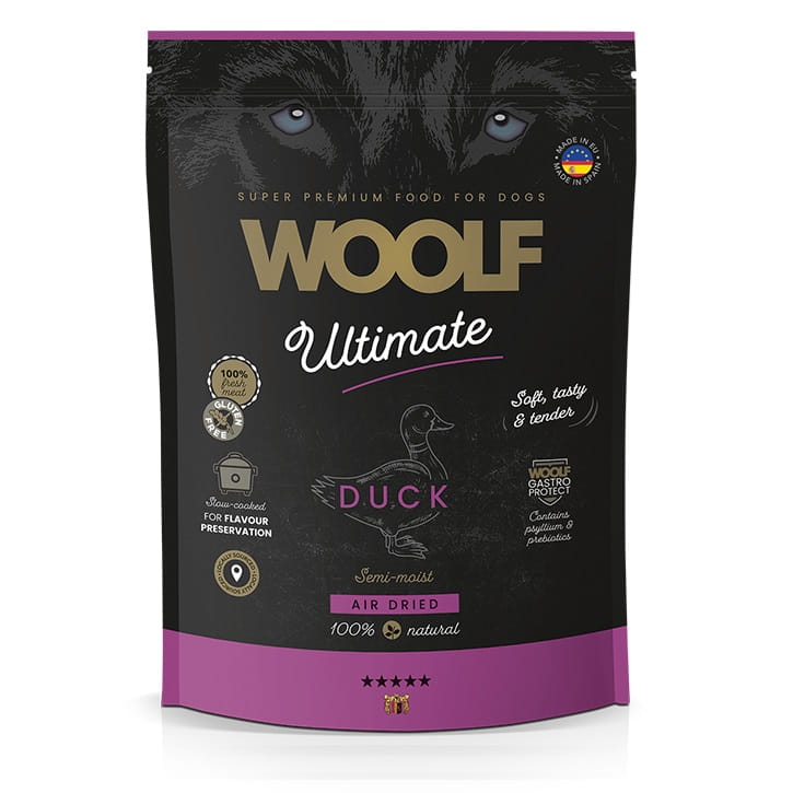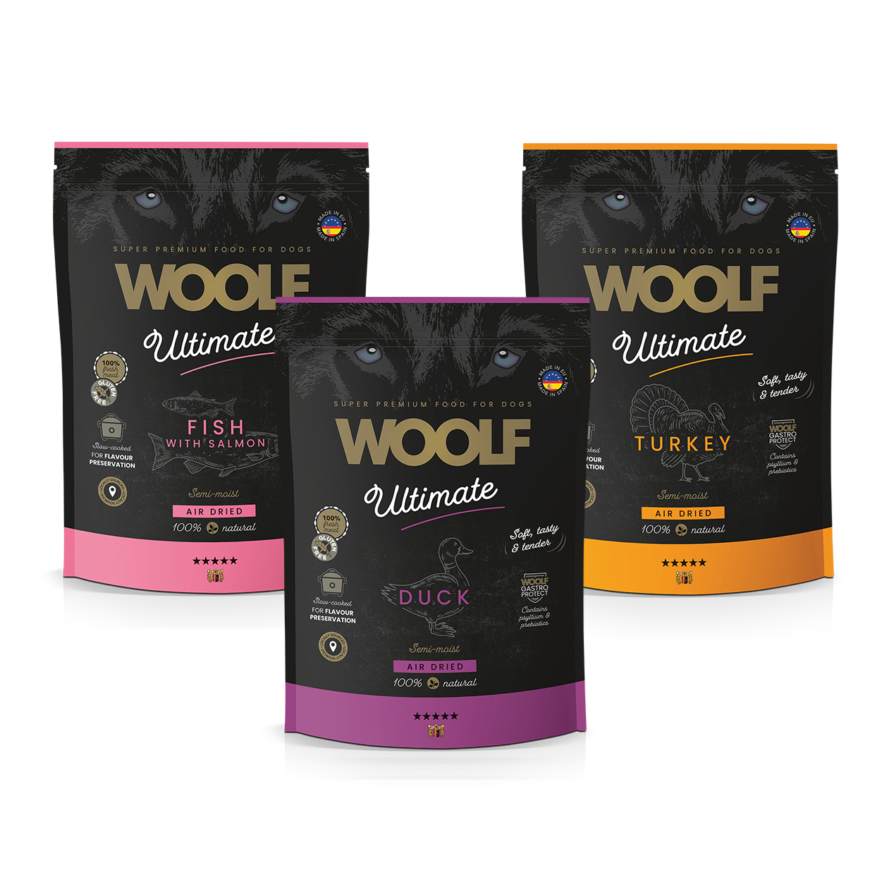 Pełnoporcjowe karmy półwilgotne dla psów – WOOLF Ultimate, dostępne w 4 smakach, wśród których znajduje się także propozycja dedykowana szczeniętom. Karmy zostały stworzone na bazie ograniczonej liczby składników (95% przepisu to kompozycja 4 komponentów), w których na pierwszym miejscu widnieje świeże mięso. Formuły zawierają optymalny stosunek Ca:P, wynoszący 1,6:1, pomagający budować zdrowe kości i zęby, nienasycone kwasy omega-3 z łososia, wspierające zdrowie skóry, sierści oraz funkcje poznawcze, a także psyllium i probiotyki, niezbędne w trosce o prawidłowy przebieg trawienia. Receptury są bezzbożowe, bezglutenowe i wyprodukowane na terenie Unii Europejskiej.