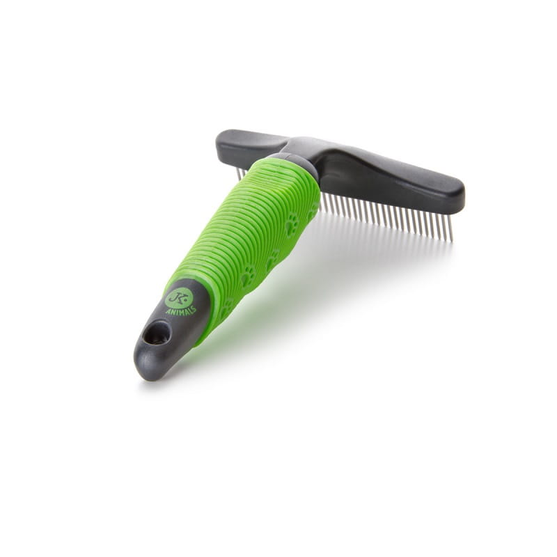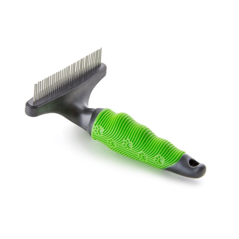 Grzebień posiada profesjonalny miękki, ergonomiczny uchwyt dla maksymalnego komfortu i kontroli użytkowania. Grzebień z 37 obrotowymi, sprężynującymi grotami przeznaczony dla wszystkich rodzajów sierści i podszerstka. Obrotowe stożkowe groty zapobiegają bolesnemu ciągnięciu oraz sprawnie usuwają martwa sierść i podszerstek.