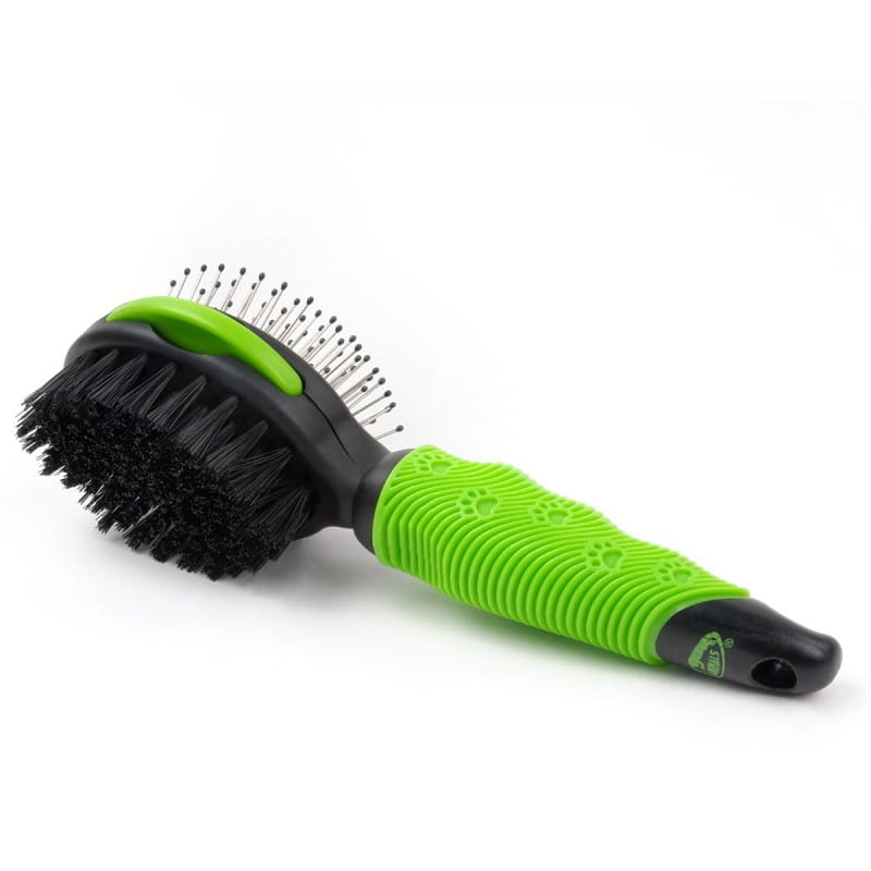 Szczotka posiada profesjonalny miękki, ergonomiczny uchwyt dla maksymalnego komfortu i kontroli użytkowania. Owalna obustronna szczotka 3 w 1 z dwoma funkcjami. Gładkie groty szczotki z kulkami delikatnie masują skórę zwierzęcia i pomagają poprawić jej ukrwienie. Nylonowe włosie zapewnia lśniącą i dobrze utrzymaną sierść. Obustronna szczotka zapewnia istotną, podstawową pielęgnację sierści zwierzęcia. Z boku szczotki znajduje sie mały grzebień, który jest używany do doczesywania w wąskich lub trudno dostępnych miejscach.