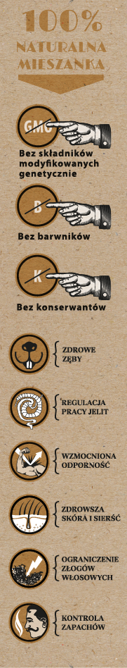 Skład: ziarna: pszenicy, kukurydzy, otręby pszenne, owies, jęczmień, susz jabłkowy, suszona: marchew, pasternak, płatki grochu, gryka, proso żółte, proso czerwone, sorgo, dari, wyka, konopie, rzepak, ryż, płatki owsiane, płatki kukurydziane, kardi, nasiona słonecznika, siemię lniane, suszony kwiat nagietka, larwy mącznika młynarka, kiełż zdrojowy, ostropest plamisty, fasola mung, spirulina, inulina, ekstrakt z Yukki schidigera, materiały paszowe pochodzenia mineralnego. Dodatki (w 100g mieszanki): Dodatki dietetyczne: Wit. A (E672 retinol)- 665 j.m; Wit. B12 (cyjanokobalamina)- 3,8mcg; Wit. B6 (chlorowodorek pirydoksyny)- 0,532mg; Wit. B1 (tiamina)- 0,285mg; Wit. B2 (ryboflawina)- 0,532mg; Wit. K3 (menadion)- 0,038mg; Wit. D3 (E671 cholekalcyferol) – 38j.m; Wit. E (alfa-tokoferol)- 5,32mg; Mangan (E5 tlenek manganu)- 0,19mg; Jod (E2 jodek potasu)- 0,019mg; Kobalt (E3 węglan kobaltu xH2O)- 0,19mg; Miedź (E4 siarczan miedzi x 5H2O) – 0,152mg; Cynk (E6 tlenek cynku)- 0,38mg; Żelazo (E1 siarczan żelaza xH2O)- 3,23mg; dodatki technologiczne: spoiwa (bentonit, sepiolit).