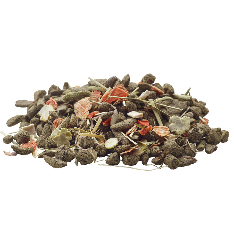Skład: produkty pochodzenia roślinnego (tymotka, trawy i zioła 23%), warzywa (groch zielony 12,5%, marchew 6,3%, pasternak 2,6%), owoce, nasiona, minerały, roślinne ekstrakty białkowe, oleje i tłuszcze, FOS, nagietek, MOS, algi, jukka