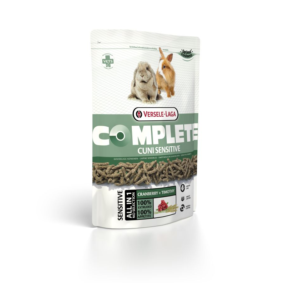Cuni Sensitive Complete to w 100% ekstrudowana karma o zmniejszonej wartości energetycznej , przeznaczona dla wrażliwych, mało aktywnych lub starszych królików. Wspomaga trawienie i prawidłowe funkcjonowanie dróg moczowych.