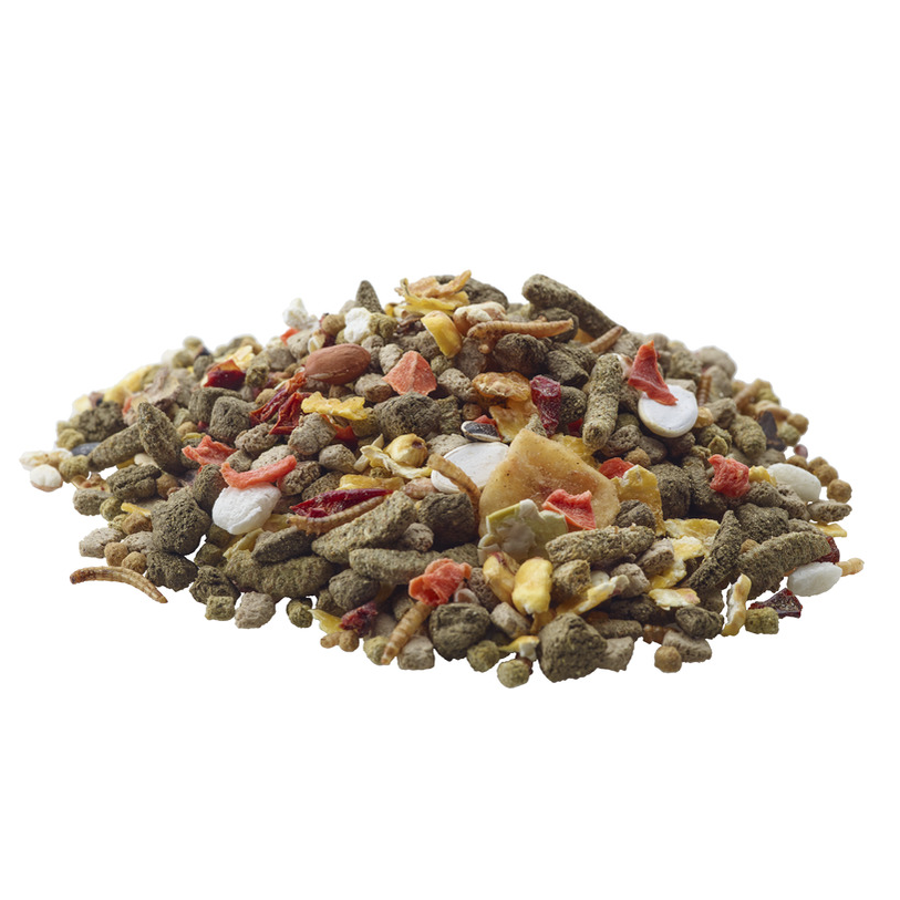 Skład: Zboża (kukurydza 17%), produkty pochodzenia roślinnego, warzywa (groch 12%, papryczka czerwona 2%, marchew 2%), nasiona, owoce (banan 1%, rodzynki 1%), roślinne ekstrakty białkowe, owady (larwy mącznika 4%), orzechy, minerały, drożdże, zioła, oleje i tłuszcze, nagietek, FOS, MOS, pestki winogron, algi, jukka