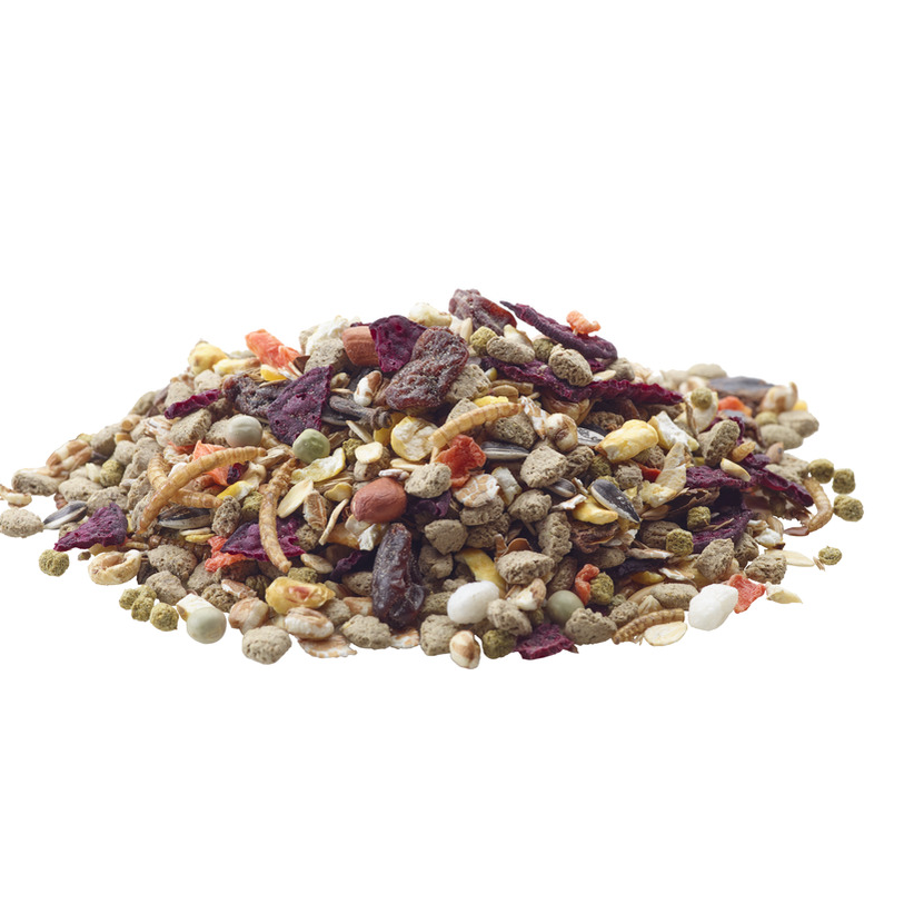 Skład: Zboża (pszenica 8,5%), produkty pochodzenia roślinnego, warzywa (groch 7,5%, burak ćwikłowy 3%, marchew 2%), nasiona, owoce (rodzynki 3%), roślinne ekstrakty białkowe, owady (larwy mącznika 4%), orzechy, minerały, zioła, MOS, FOS, nagietek, pestki winogron