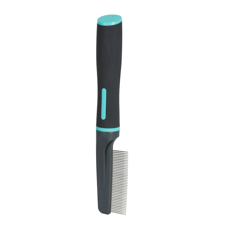 GĘSTY GRZEBIEŃ - dzięki 40 wąsko rozstawionym i wytrzymałym zębom, grzebień rozczesuje i wygładza sierść, a tym samym zapobiega powstawaniu kołtunów. Zaokrąglone na końcach zęby wykonane ze stali nierdzewnej chronią skórę zwierzęcia przed podrażnieniem.